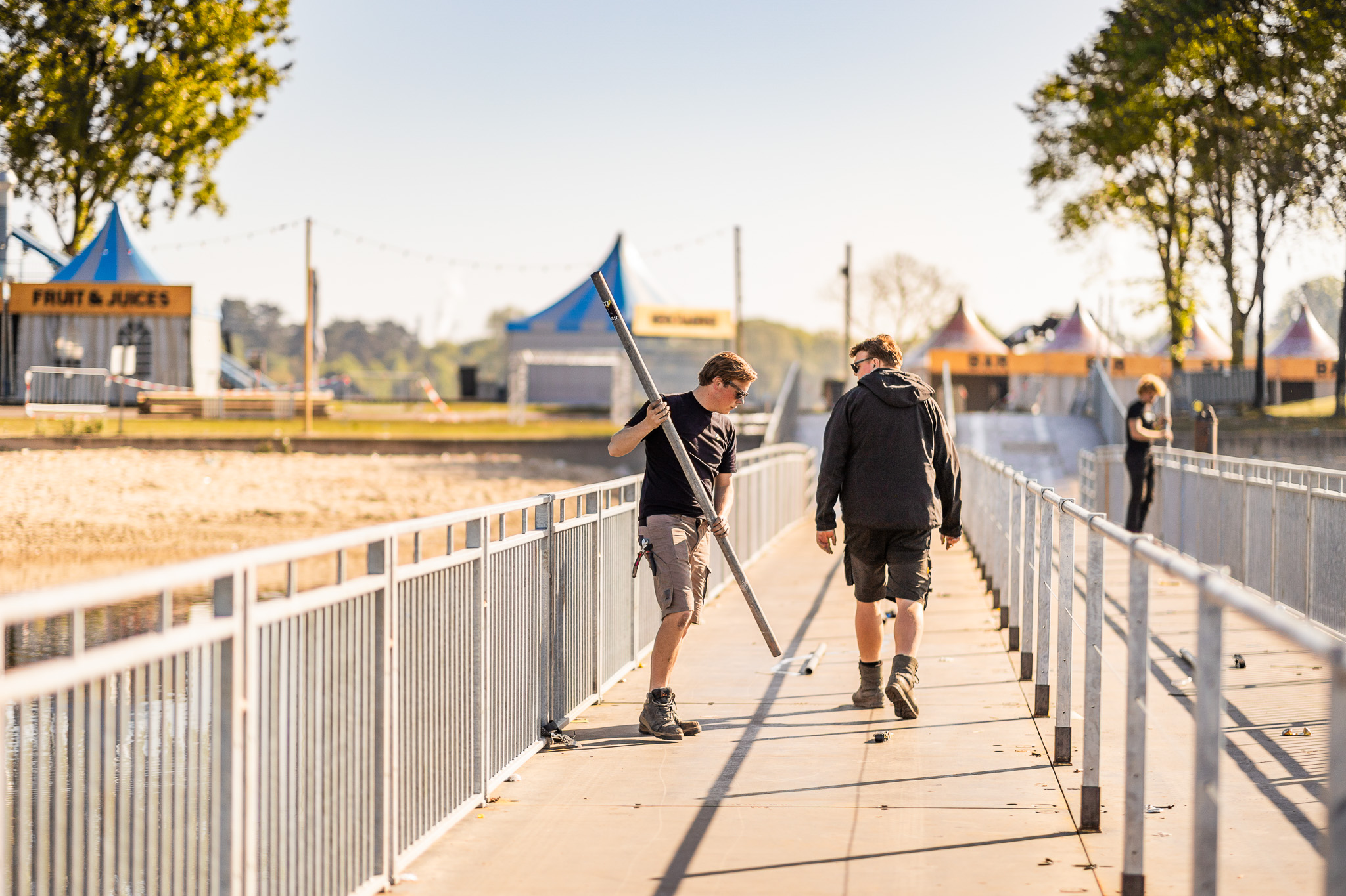 Die manier van denken zie je ook terug op de vloer. Tijdens het Festival op de Ring (750 jaar Amsterdam) werkten we in de volle zon (30+ graden) op heet asfalt. Daar zijn we voor het eerst gaan werken met lichtgekleurde shirts, extra water en meer korte pauzes. Die aanpak hebben we daarna het hele seizoen doorgezet. Zo hebben we extra ingezet op veilig werken rondom machinerie, werken we op drukke verkeersplekken en in de nacht standaard met reflecterende vestjes om aanrijdrisico’s verder te verkleinen. En sinds de vorige editie van Defqon.1 hoort een health and safety briefing standaard bij onze aanpak. Ook zit er tegenwoordig ruim voldoende gehoorbescherming in onze materiaalkisten, zodat onze mensen ook in omgevingen met hoge geluidsbelasting prettig en verantwoord kunnen werken.